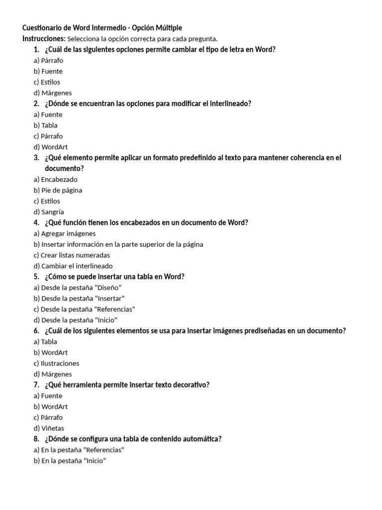 1. ¿Cuál de las siguientes opciones permite cambiar el tipo de letra en Word?