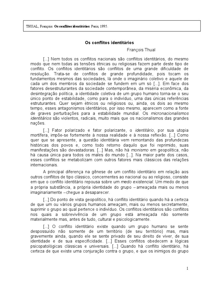 Os conflitos identitrios Franois Thual [...] Nem todos os conflitos nacionais so conflitos identitrios, do mesmo modo que nem todas as tenses tnicas ou religiosas fazem parte deste tipo de conflito. Os conflitos identitrios so conflitos de uma grande dificuldade de resoluo. Trata-se de conflitos de grande profundidade, pois tocam os fundamentos mesmos das sociedades, l onde o imaginrio coletivo e aquele de cada um dos membros da sociedade se fundem em um s [...]. Em face dos fatores desestruturantes da sociedade contempornea, da misria econmica, da desintegrao poltica, a identidade coletiva de um grupo humano torna-se o seu nico ponto de estabilidade, como para o indivduo, uma das nicas referncias estruturantes. Quer sejam tnicos ou religiosos ou, ainda, os dois ao mesmo tempo, esses antagonismos identitrios, por isso mesmo, aparecem como a fonte de graves perturbaes para a estabilidade mundial. Os micronacionalismos identitrios so violentos, radicais, muito mais que os nacionalismos das grandes naes. [...] Fator polarizado e fator polarizante, o identitrio, por sua utopia mortfera, impe-se fortemente nossa realidade e nossa reflexo. [...] Como quer que se apresente, a questo identitria vem remontando das profundezas histricas dos povos e, como todo retorno daquilo que foi reprimido, suas manifestaes so devastadoras. [...] Mas, no h monismo em geopoltica, no h causa nica para todos os males do mundo [...]. Na maior parte dos casos, esses conflitos se metabolizam com outros fatores mais clssicos das relaes internacionais. A principal diferena na gnese de um conflito identitrio em relao aos outros conflitos de tipo clssico, concernentes ao nacional ou ao religioso, consiste em que o conflito identitrio repousa sobre um medo existencial. Um medo de que a prpria substncia, a prpria identidade do grupo ameaada mais ou menos imaginariamente chegue a desaparecer. [...] Do ponto de vista geopoltico, h conflito identitrio quando h a certeza de que um ou vrios grupos humanos ameaam, mais ou menos secretamente, suprimir o grupo ao qual pertence o indivduo. Os conflitos identitrios so conflitos nos quais a sobrevivncia de um grupo est ameaada no somente materialmente mas, antes de tudo, cultural e psicologicamente. [...] O conflito identitrio existe quando um grupo humano se sente despossudo no somente de um territrio (de seu territrio) mas, mais gravemente ainda, quando ele se sente privado de seu direito de viver, de sua identidade e de sua especificidade. [...] Esses conflitos obedecem a lgicas psicopatolgicas clssicas e universais. [...] Quando h conflito identitrio, h certeza de que existe uma conjurao contra o grupo, e que os inimigos do grupo