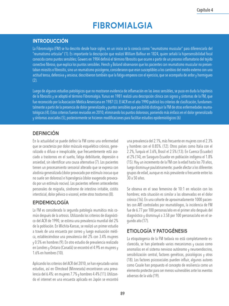 Fuente: Crofford LJ. Fibromyalgia. En: Firestein G, Budd R, Gabriel S. Kelley & Firestein´s. Textbook of Rheumatology. TenthEdition Vol. II, Elsevier, 2017, p. 768-783.