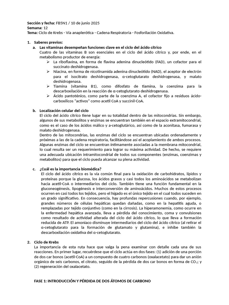 Tema: Ciclo de Krebs - Vía anaplerótica - Cadena Respiratoria - Fosforilación Oxidativa.