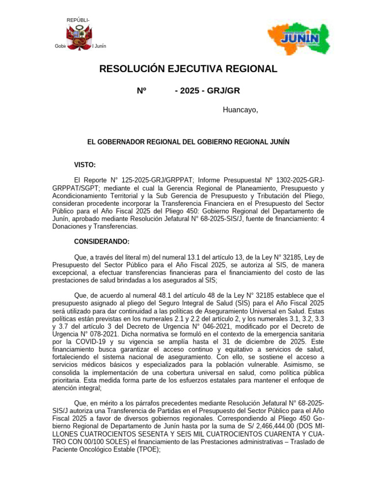 El Reporte N° 125-2025-GRJ/GRPPAT; Informe Presupuestal Nº 1302-2025-GRJ-