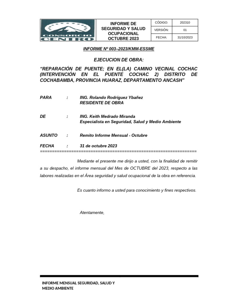 INFORME MENSUAL SEGURIDAD, SALUD Y