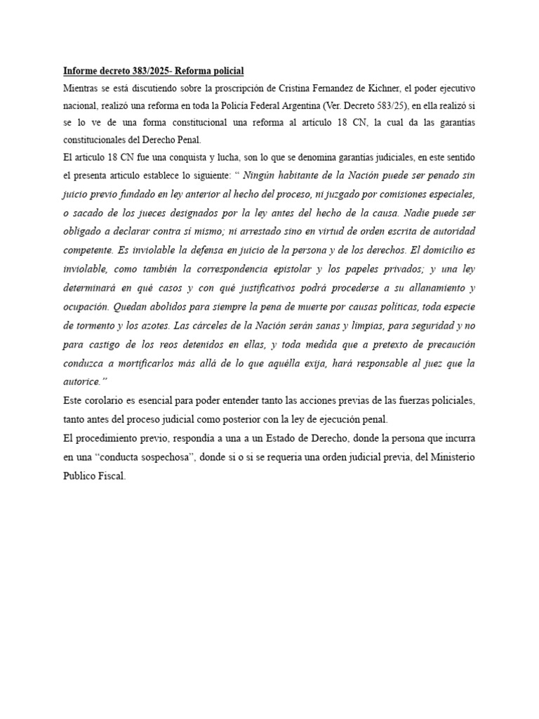nacional, realizó una reforma en toda la Policía Federal Argentina (Ver. Decreto 583/25), en ella realizó si