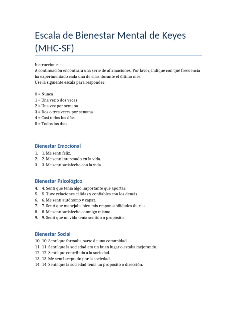 la Escala de Bienestar Mental de Keyes (MHC-SF, 14 ítems). Sin embargo: