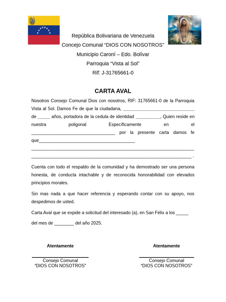 Carta Aval que se expide a solicitud del interesado (a), en San Félix a los _____