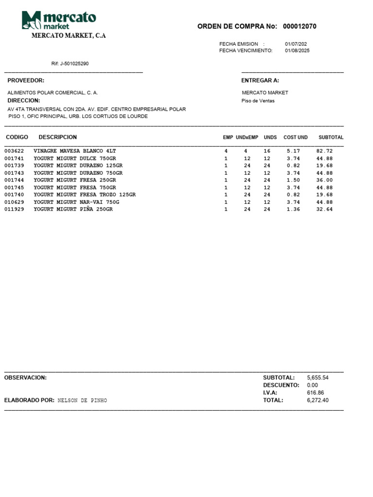 ORDEN DE COMPRA No: 000012070