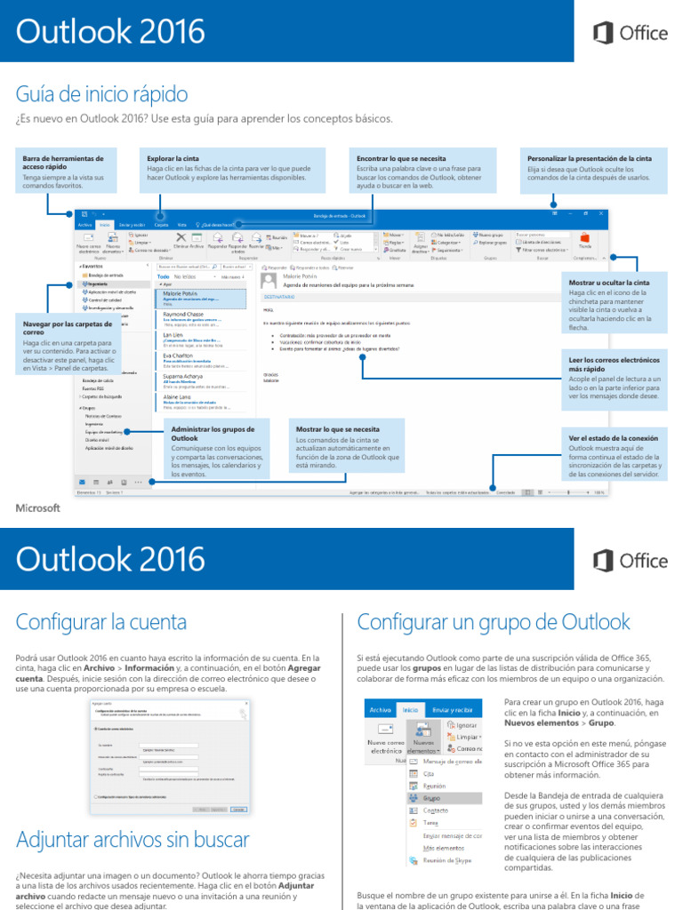 Visite http://aka.ms/office-2016-guides para descargar nuestras guías de inicio Explore las características nuevas y mejoradas de Outlook 2016 y del resto de las