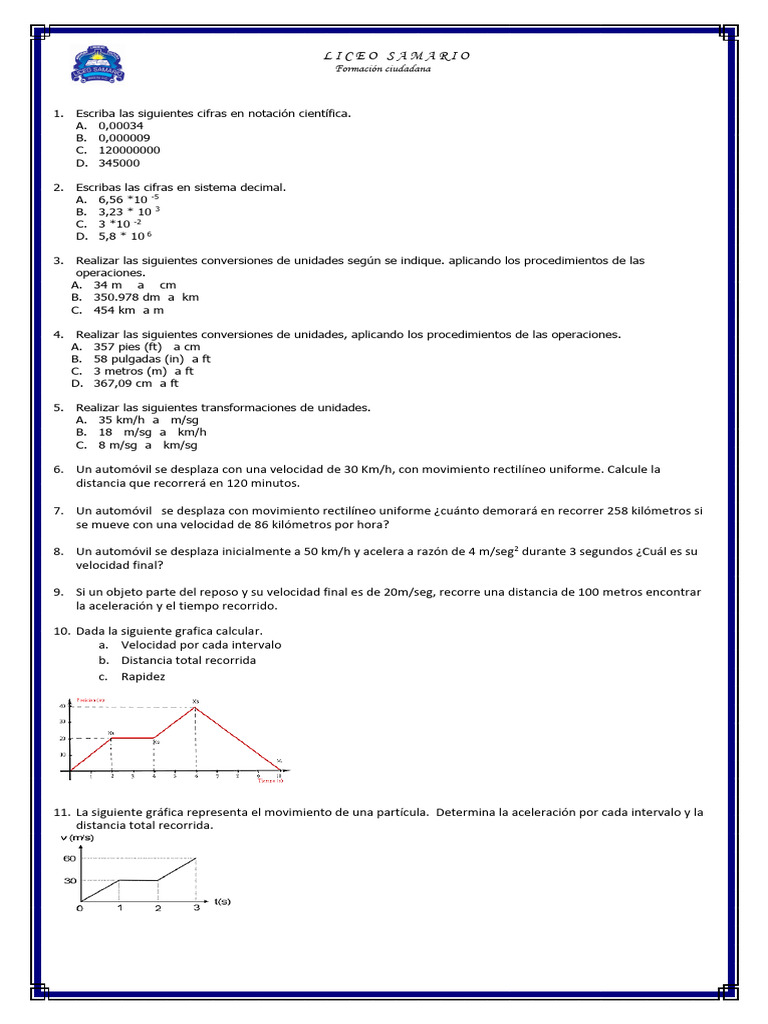 6. Un automóvil se desplaza con una velocidad de 30 Km/h, con movimiento rectilíneo uniforme. Calcule la