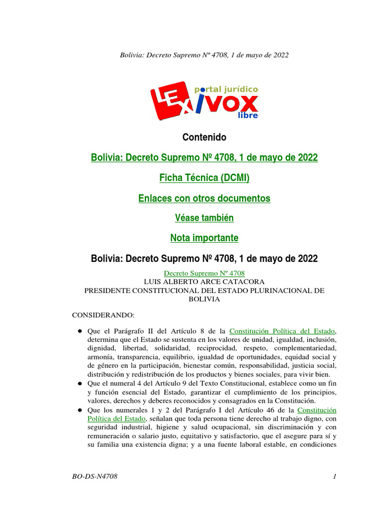 Bolivia: Decreto Supremo Nº 4708, 1 de mayo de 2022 . . . . . . 1