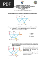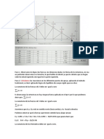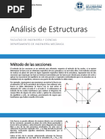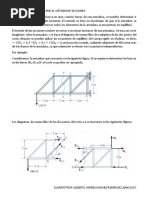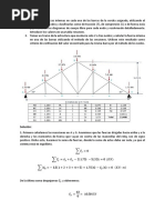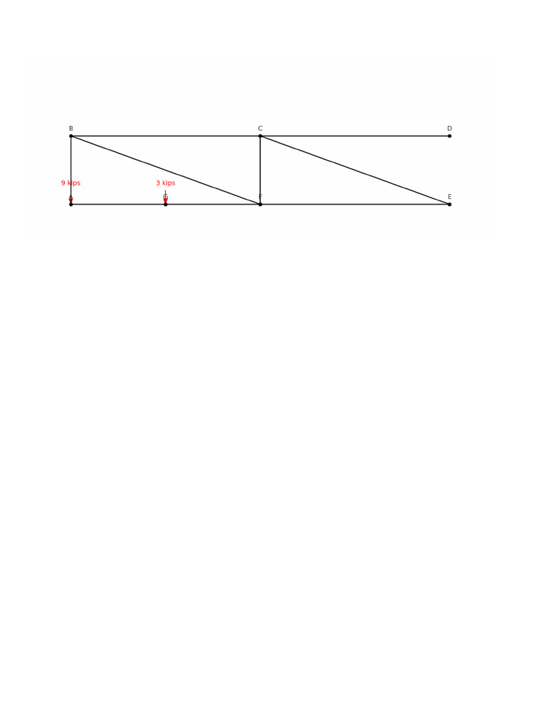 Se calcula la fuerza en el miembro BF de una cercha utilizando el método de secciones. Se realiza un corte que incluye los miembros BF, CF y CE, y se toman momentos respecto al nodo C para determinar la fuerza en BF, resultando en 47.0 kips en tensión. La inclinación del miembro BF se determina mediante trigonometría, confirmando que está en tensión debido al valor positivo obtenido.
