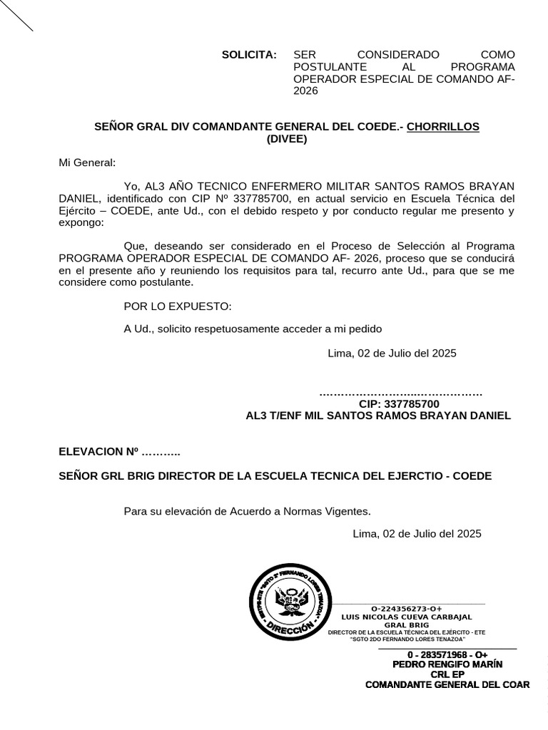 Ejército – COEDE, ante Ud., con el debido respeto y por conducto regular me presento y