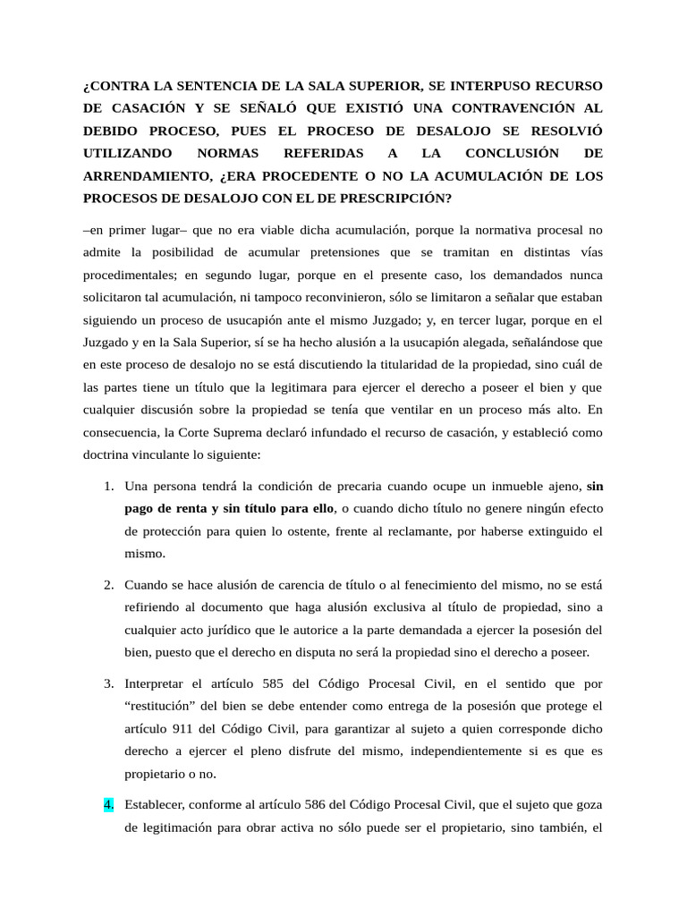 5. La Corte Suprema precisó que el proceso de desalojo por ocupación precaria es de