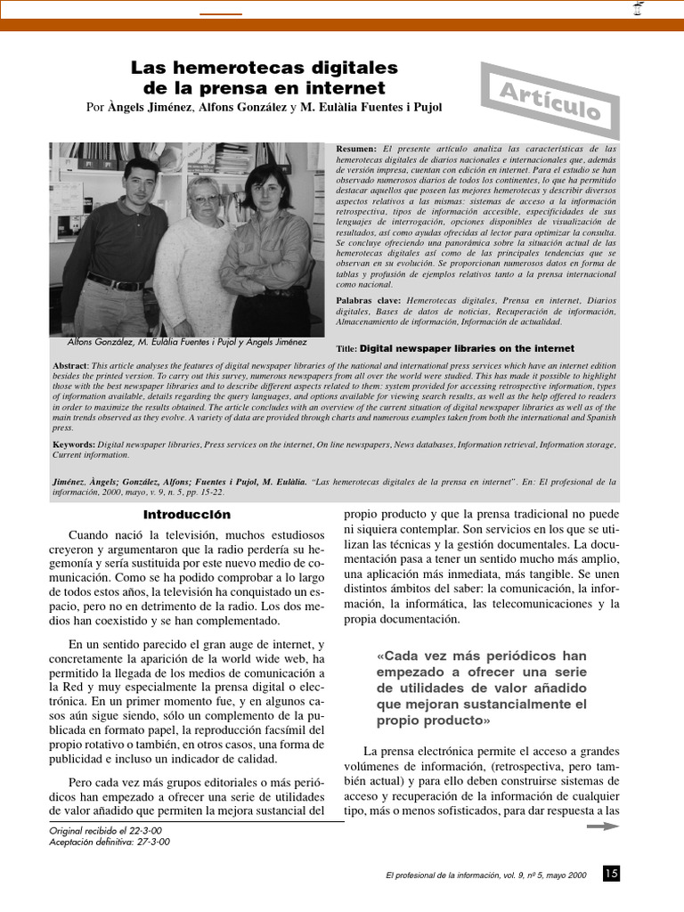 Jiménez, Àngels; González, Alfons; Fuentes i Pujol, M. Eulàlia. “Las hemerotecas digitales de la prensa en internet”. En: El profesional de la