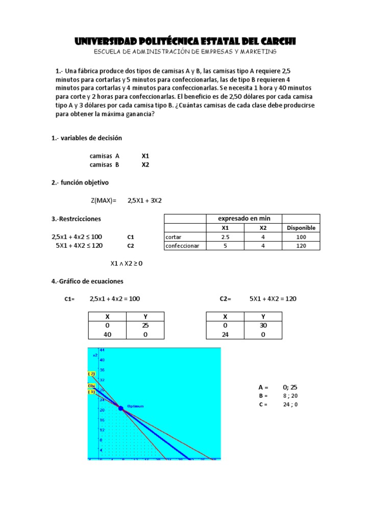 1.- Una fbrica produce dos tipos de camisas A y B, las camisas tipo A requiere 2,5 minutos para cortarlas y 5 minutos para confeccionarlas, las de tipo B requieren 4 minutos para cortarlas y 4 minutos para confeccionarlas. Se necesita 1 hora y 40 minutos para corte y 2 horas para confeccionarlas. El beneficio es de 2,50 dlares por cada camisa tipo A y 3 dlares por cada camisa tipo B. Cuntas camisas de cada clase debe producirse para obtener la mxima ganancia? 1.- variables de decisin camisas A camisas B 2.- funcin objetivo Z(MAX)= 3.-Restrcicciones 2,5x1 + 4x2 100 5X1 + 4X2 120