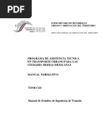 Este documento forma parte de un conjunto de manuales desarrollados con el fin de orientar a las instituciones responsables a nivel central, estatal y municipal en las auxiliar y tareas inherentes a los procesos de solucin de los problemas de transporte urbano en las ciudades medias mexicanas. Partiendo del concepto de que es necesario investigar y analizar los problemas de transporte manera integral, se ha desarrollado una metodologa de trabajo que considera urbano de reas cinco de accin: desarrollo institucional, vialidad y trnsito, mantenimiento vial, transporte pblico e impacto ambiental. El estudio exhaustivo de estas reas abarca diferentes mismos que son contemplados en los manuales desarrollados, los que aspectos, se recomienda utilizar como gua primero y como herramientas despus, en los procesos de anlisis de los problemas del transporte urbano en las ciudades. Es importante sealar que estos manuales, a pesar de ser independientes entre s, mantienen estructura coherente como conjunto, dado que son piezas a ser a la vez una utilizadas integralmente para el logro de la meta central: el mejoramiento de la calidad de vida de las ciudades a travs de uno de sus elementos esenciales, el transporte urbano. El conjunto de manuales est formado por los siguientes tomos: I Resumen Ejecutivo de los Manuales Normativos en Transporte Urbano II Conceptos y Lineamientos para la Planeacin del Transporte Urbano III Desarrollo Institucional IV Diseo Geomtrico de Vialidades V Operacin del Transporte Pblico VI Elaboracin del Inventario del Estado Funcional de Pavimentos VII Evaluacin Socioeconmica VIII Impacto Ambiental en Estudios de Transporte Urbano IX Gua Metodolgica de Muestreo, Monitoreo y Anlisis de Contaminacin del Aire por Fuentes Mviles y por Ruido en Estudios de Transporte Urbano X Identificacin y Evaluacin del Impacto al Entorno, derivado de Obras de Infraestructura de Vialidad y Transporte Urbano XI Conceptualizacin de Proyectos Ejecutivos XII Estudios de Ingeniera de Trnsito XIII Manual Tcnico de Normas, Seguimiento y Control de Obras de Vialidad y Transporte Urbano: Libro 1.- Ejecucin y Control de Calidad de Obras Viales Libro 2.- Conservacin de Obras Viales Libro 3.- Seguimiento y Control de Obras Viales XIV Manual de Administracin de Pavimentos en Vialidades Urbanas Para saber el contenido de un manual especfico, as como para entender cmo se integran los diversos elementos del proceso que conduce, desde la observacin de un problema de transporte urbano hasta la formulacin de planes y programas de accin para resolverlo, recomienda leer el Tomo I: Resumen Ejecutivo de los Manuales Normativos en se Transporte Urbano.