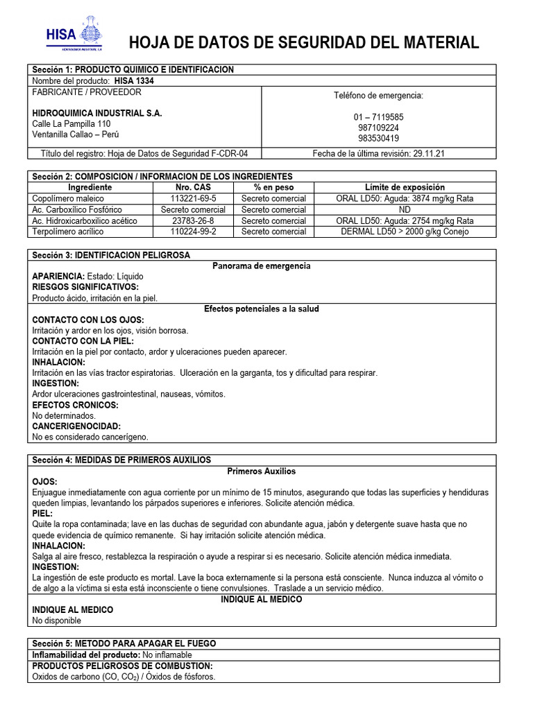 Título del registro: Hoja de Datos de Seguridad F-CDR-04 Fecha de la última revisión: 29.11.21