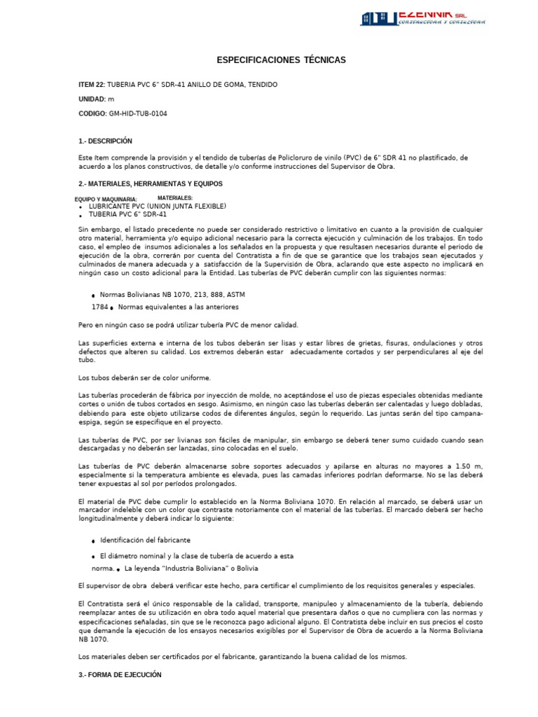 Este ítem comprende la provisión y el tendido de tuberías de Policloruro de vinilo (PVC) de 6" SDR 41 no plastificado, de