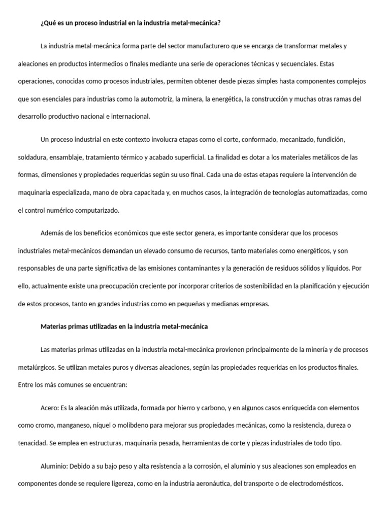 Un proceso industrial en este contexto involucra etapas como el corte, conformado, mecanizado, fundición,