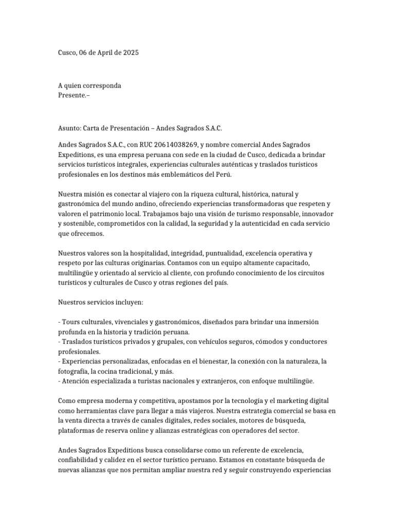 Asunto: Carta de Presentación – Andes Sagrados S.A.C.