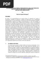 Los ensayos de deflexin se recomiendan para analizar el pavimento de concreto asfltico existente, especialmente para vas de alto volumen de trfico. Las mediciones de deflexiones deben hacerse en correspondencia con la zona transitada por la rueda externa de los vehculos. Los intervalos varan entre 30 y 300 m. Se usan dispositivos que pueden transmitir cargas cerca a 40 kN. La carga puede ser pulsante o sinusoidal. Las deflexiones se miden en correspondencia con el centro de la carga y a ciertas distancias que se explican ms adelante (Fig. 3.1). [Link] Mdulo Resiliente de la subrasante A ciertas distancias desde el lugar donde se aplica la carga, las deflexiones medidas en la superficie del pavimento se deben solamente a la subrasante y son independientes del dimetro del plato de carga. De esta manera, el Mdulo Resiliente de la subrasante MR puede ser retrocalculado con la medicin de una simple deflexin y la magnitud de la carga, con el uso de la siguiente ecuacin (AASHTO 1993)