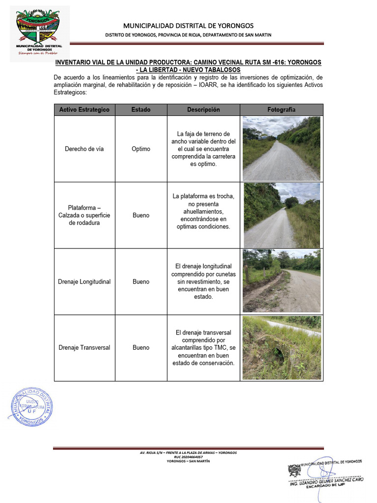 INVENTARIO VIAL DE LA UNIDAD PRODUCTORA: CAMINO VECINAL RUTA SM -616: YORONGOS
