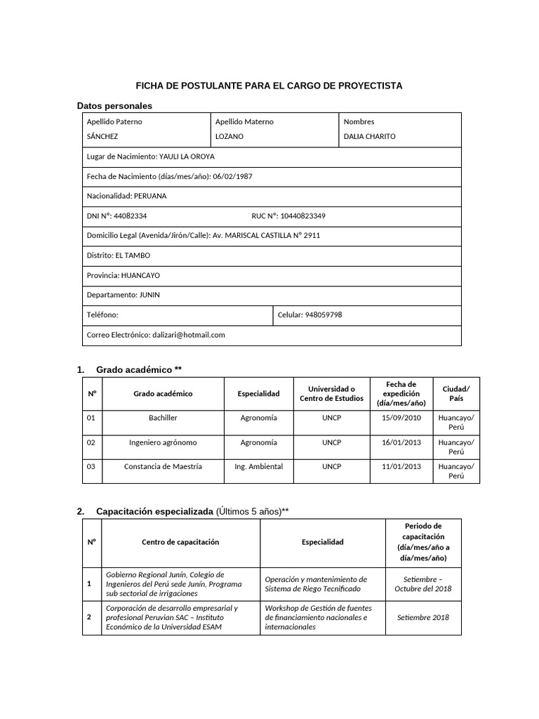 FICHA DE POSTULANTE PARA EL CARGO DE PROYECTISTA
