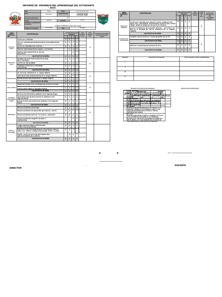 CALIFICATIVO DE ÁREA B A A A Periodos Comentarios del docente Firma del padre, madre o apoderado(a)