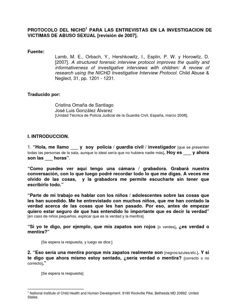 PROTOCOLO DEL NICHD1 PARA LAS ENTREVISTAS EN LA INVESTIGACION DE VICTIMAS DE ABUSO SEXUAL [revisin de 2007].