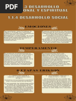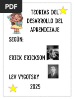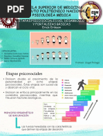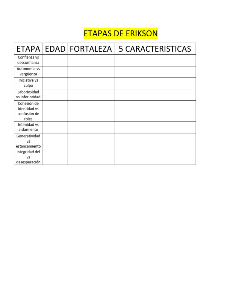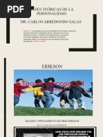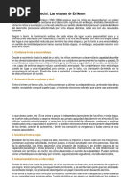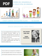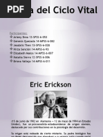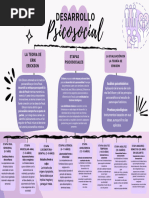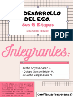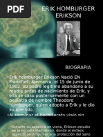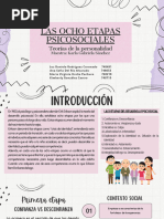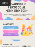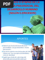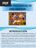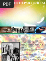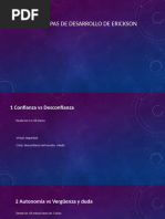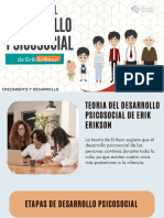 El documento presenta las etapas del desarrollo psicosocial según Erikson, que abarcan desde la infancia hasta la adultez. Cada etapa está marcada por un conflicto que debe resolverse, lo que fortalece el desarrollo personal. Las etapas incluyen confianza vs desconfianza, autonomía vs vergüenza, entre otras.