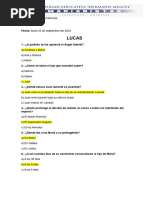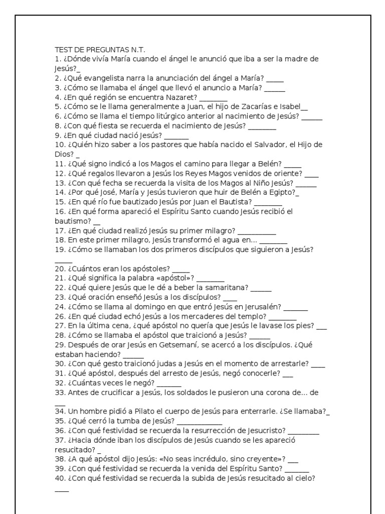 Qu evangelista narra la anunciacin del ngel a Mara? _____ 3. Cmo se llamaba el ngel que llev el anuncio a Mara? ______ 4. En qu regin se encuentra Nazaret? ________ 5. Cmo se le llama generalmente a Juan, el hijo de Zacaras e Isabel__ 6. Cmo se llama el tiempo litrgico anterior al nacimiento de Jess? ______ 8. Con qu fiesta se recuerda el nacimiento de Jess? ________ 9. En qu ciudad naci Jess? _______ 10. Quin hizo saber a los pastores que haba nacido el Salvador, el Hijo de Dios? _ 11. Qu signo indic a los Magos el camino para llegar a Beln? _____ 12. Qu regalos llevaron a Jess los Reyes Magos venidos de oriente? ____ 13. Con qu fecha se recuerda la visita de los Magos al Nio Jess? ______ 14. Por qu Jos, Mara y Jess tuvieron que huir de Beln a Egipto?_ 15. En qu ro fue bautizado Jess por Juan el Bautista? ________ 16. En qu forma apareci el Espritu Santo cuando Jess recibi el bautismo? __ 17. En qu ciudad realiz Jess su primer milagro? ___________ 18. En este primer milagro, Jess transform el agua en... ________ 19. Cmo se llamaban los dos primeros discpulos que siguieron a Jess? _____ 20. Cuntos eran los apstoles? _____ 21. Qu significa la palabra apstol? ________ 22. Qu quiere Jess que le d a beber la samaritana? ______ 23. Qu oracin ense Jess a los discpulos? ____ 24. Cmo se llama al domingo en que entr Jess en Jerusaln? _______ 26. En qu ciudad ech Jess a los mercaderes del templo? ________ 27. En la ltima cena, qu apstol no quera que Jess le lavase los pies? ___ 28. Cmo se llamaba el apstol que traicion a Jess? ______ 29. Despus de orar Jess en Getseman, se acerc a los discpulos. Qu estaban haciendo? ______ 30. Con qu gesto traicion judas a Jess en el momento de arrestarle? ____ 31. Qu apstol, despus del arresto de Jess, neg conocerle? ___ 32. Cuntas veces le neg? _______ 33. Antes de crucificar a Jess, los soldados le pusieron una corona de... de ___ 34. Un hombre pidi a Pilato el cuerpo de Jess para enterrarle. Se llamaba?_ 35. Qu cerr la tumba de Jess? _____________ 36. Con qu festividad se recuerda la resurreccin de Jesucristo? _________ 37. Hacia dnde iban los discpulos de Jess cuando se les apareci resucitado? _ 38. A qu apstol dijo Jess: No seas incrdulo, sino creyente? ___ 39. Con qu festividad se recuerda la venida del Espritu Santo? _______ 40. Con qu festividad se recuerda la subida de Jess resucitado al cielo? ____