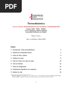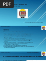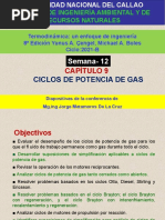 El documento aborda los ciclos de potencia de gas, incluyendo el ciclo de Carnot y el ciclo de Otto, destacando su importancia en la ingeniería y el análisis termodinámico. Se discuten las idealizaciones necesarias para simplificar el estudio de estos ciclos, así como las características de las máquinas térmicas y reciprocantes. Además, se menciona el ciclo Diesel y otros ciclos como Stirling y Ericsson, que utilizan procesos de regeneración.