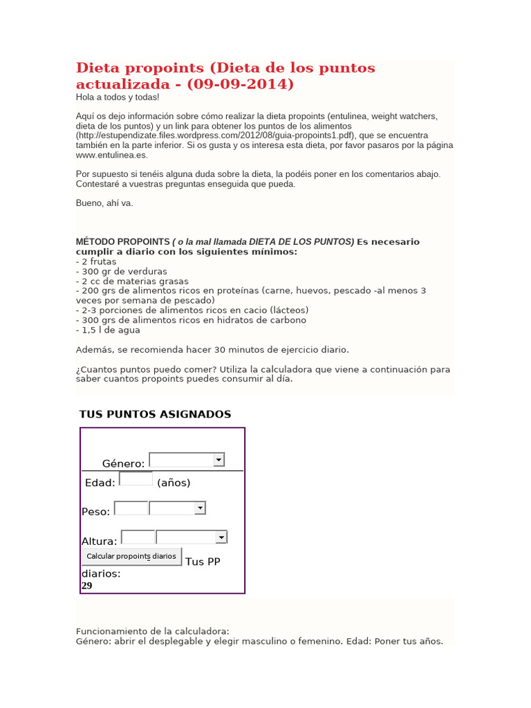 dieta de los puntos) y un link para obtener los puntos de los alimentos