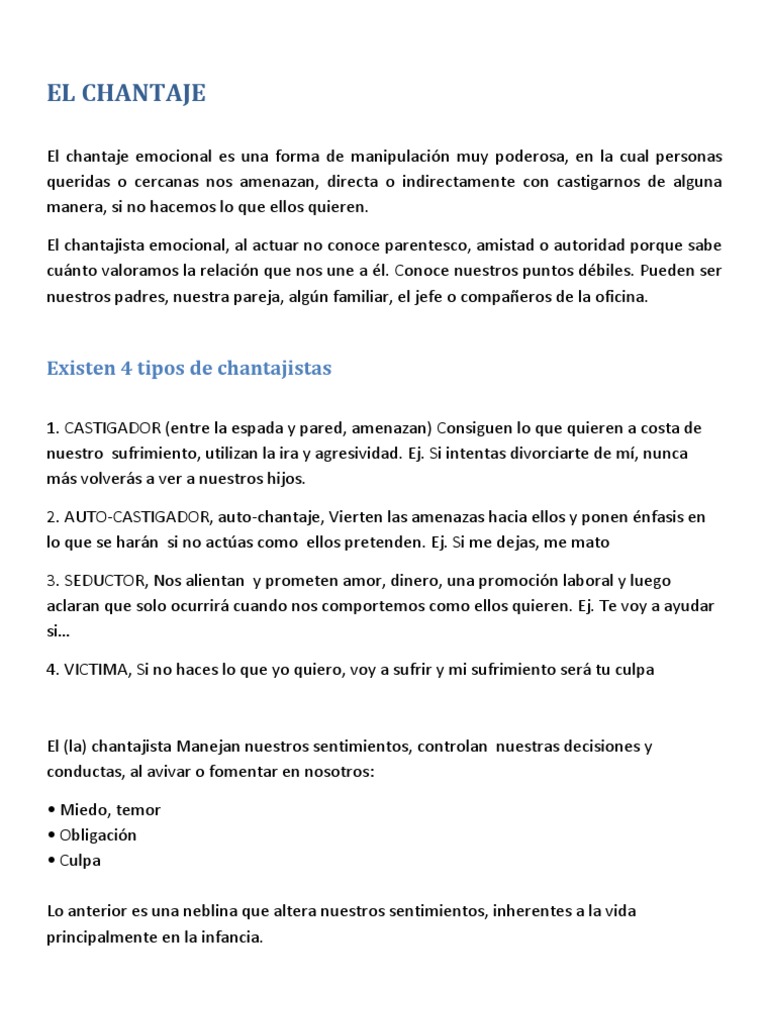 1. CASTIGADOR (entre la espada y pared, amenazan) Consiguen lo que quieren a costa de nuestro sufrimiento, utilizan la ira y agresividad. Ej. Si intentas divorciarte de m, nunca ms volvers a ver a nuestros hijos. 2. AUTO-CASTIGADOR, auto-chantaje, Vierten las amenazas hacia ellos y ponen nfasis en lo que se harn si no actas como ellos pretenden. Ej. Si me dejas, me mato 3. SEDUCTOR, Nos alientan y prometen amor, dinero, una promocin laboral y luego aclaran que solo ocurrir cuando nos comportemos como ellos quieren. Ej. Te voy a ayudar si 4. VICTIMA, Si no haces lo que yo quiero, voy a sufrir y mi sufrimiento ser tu culpa
