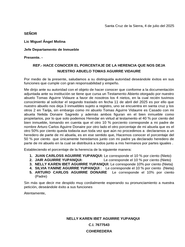 REF.- HACE CONOCER EL PORCENTAJE DE LA HERENCIA QUE NOS DEJA