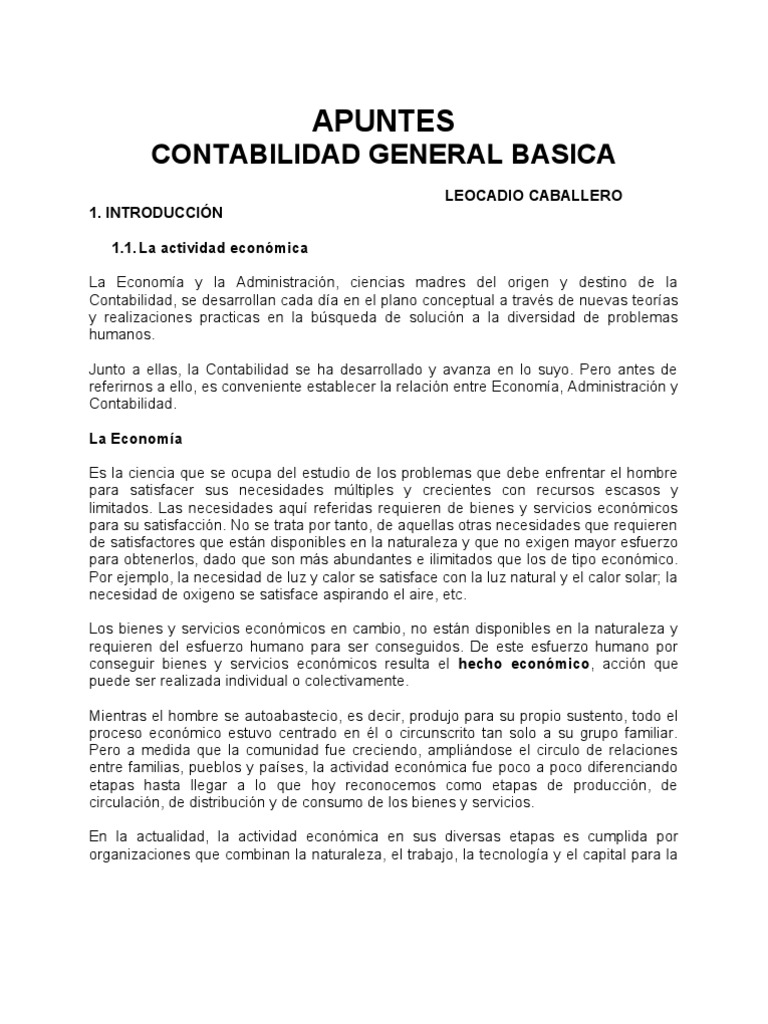 obtencin de los bienes y servicios necesarios para la satisfaccin de las necesidades humanas, al menos parcialmente. Estas organizaciones son las denominadas unidades econmicas o empresas, cuyo objetivo puede o no estar orientado por el nimo de lucro, y para cuyo logro utilizan factores productivos para obtener los bienes y servicios. La Administracin Es por su parte, la ciencia que norma, regula y orienta a la empresa en su creacin, crecimiento, desarrollo y logro de objetivos a travs de un proceso que involucra las etapas de: planeacin, organizacin, direccin, ejecucin y control, sin excluir las acciones de coordinacin. En una pequea empresa, generalmente de propiedad de un slo dueo, todo este proceso esta centrado en su nico propietario, quien conociendo la naturaleza de las actividades y el volumen reducido de operaciones est, aunque no siempre, en condiciones de decidir sobre la vida de la empresa. A medida que la empresa crece, la administracin de la misma se torna ms compleja por lo que l o los dueos ya no pueden actuar por s solos como administradores; se produce una divisin casi natural del trabajo, en donde la informacin y el control se constituyen en requisitos insustituibles para la toma de decisiones de los encargados de la direccin y ejecucin de los proyectos empresariales. La Contabilidad Por su parte, si se la identifica por su funcin y objetivo, diremos que es una disciplina que mide, registra e informa de los hechos econmicos ocurridos en la unidad econmica que hemos denominado empresa. Qu mide y registra la Contabilidad? Hechos econmicos es la respuesta. He ah la relacin entre contabilidad y economa. Esta relacin se encuentra vinculada a la accin de medicin y registro de hechos que son de carcter econmico y que constituyen la funcin que cumple la Contabilidad. Para que la Contabilidad mide y registra estos hechos econmicos? Para proveer de informacin a quienes deben tomar decisiones acerca de la empresa, es decir, a los administradores de ella. He ah la relacin entre contabilidad y administracin. Esta es considerada la materia prima en el proceso de toma de decisiones. La relacin est entonces vinculada al objetivo principal de la contabilidad: proveer de informacin acerca de los hechos econmicos, para que los directivos formulen sus decisiones de gestin y de planeacin (acciones peridicas y futuras). En resumen, es posible sintetizar la relacin de la economa con la contabilidad a travs de la funcin de esta ultima, es decir, la medicin y registro de los hechos econmicos.