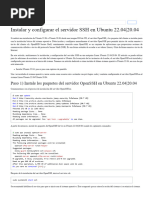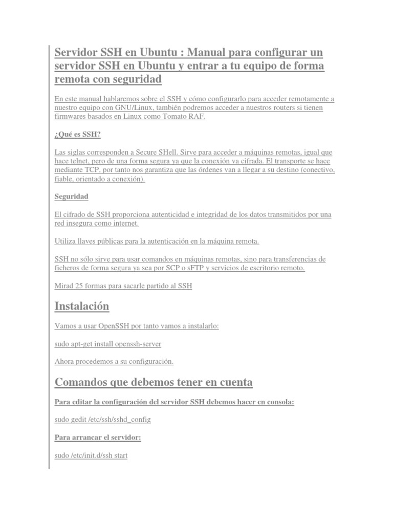 Para editar la configuracin del servidor SSH debemos hacer en consola: sudo gedit /etc/ssh/sshd_config Para arrancar el servidor: sudo /etc/init.d/ssh start