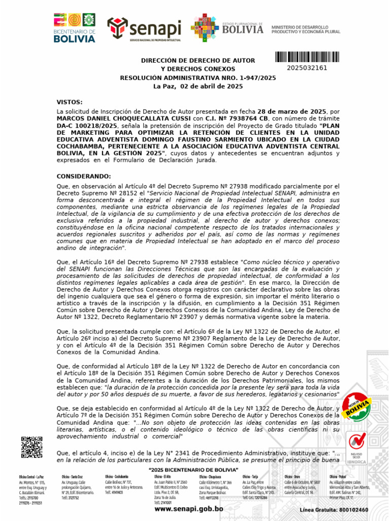 GESTIÓN 2025" a favor del autor y titular: MARCOS DANIEL CHOQUECALLATA CUSSI con