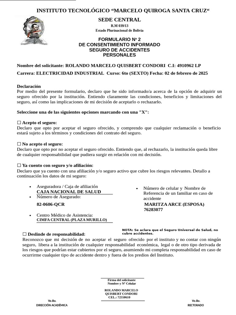 Nombre del solicitante: ROLANDO MARCELO QUISBERT CONDORI C.I: 4910962 LP