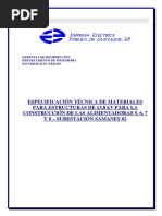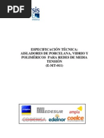 Los aisladores de porcelana deben fabricarse por proceso [Link] la superficie expuesta de los aisladores de porcelana debe cubrirse con un vitrificado de tipo compresin duro, liso, brillante e impermeable a la humedad; que le permita, por medio del lavado natural de las aguas lluvias, mantenerse fcilmente libre de polvo o suciedades residuales ocasionadas por la contaminacin ambiental. La superficie total del aislador, con excepcin de la superficie de quema, deber estar esmaltada. La superficie total deber estar libre de [Link] porcelana utilizada no tiene que presentar porosidades; debiendo ser de alta resistencia dielctrica, elevada resistencia mecnica, qumicamente inerte y elevado punto de [Link] acoples metlicos de los extremos, los cuales transmiten los esfuerzos mecnicos del conductor a un extremo del ncleo y del otro extremo del ncleo al apoyo, debern ser de acero forjado y galvanizados en caliente. Las certificaciones deben ser emitidas por un laboratorio acreditado
