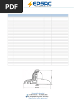 MATERIAL Norma de fabricacin Clase Norma del esmaltado DISTANCIAS CRTICAS Distancia de arco. Distancia de fuga. Altura mnima del espigo. VALORES MECNICOS Resistencia electromecanica VALORES ELCRICOS Tensin maxima de operacin Tensin de flameo de baja frecuencia en seco. Tensin de flameo de baja frecuencia en hmedo. Tensin de flameo crtico al impulso positivo. Tension de flameo crtico al impulso negativo. Tensin de perforacin a baja frecuencia RADIO INFLUENCIA Esmalte anti-radiointerferencia RF. Voltaje de prueba RMS a tierra, KV. RIV mximo AT a 1000 KHz, V. DETALLES CONTRUCTIVOS ACABADO Color del esmalte ROSCA DEL AISLADOR Dimetro,mm EMBALAJE Empaque del lote Unidades por lote Peso neto aproximado PRUEBAS Certificado del material utilizado
