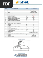 MATERIAL Norma de fabricacin Clase Norma del esmaltado DISTANCIAS CRTICAS Distancia de arco. Distancia de fuga. Altura mnima del espigo. VALORES MECNICOS Resistencia electromecanica VALORES ELCRICOS Tensin maxima de operacin Tensin de flameo de baja frecuencia en seco. Tensin de flameo de baja frecuencia en hmedo. Tensin de flameo crtico al impulso positivo. Tension de flameo crtico al impulso negativo. Tensin de perforacin a baja frecuencia RADIO INFLUENCIA Esmalte anti-radiointerferencia RF. Tensin de prueba RMS a tierra. RIV mximo AT a 1000 KHz, V. DETALLES CONTRUCTIVOS ACABADO Color del esmalte ROSCA DEL AISLADOR Dimetro EMBALAJE Empaque del lote Unidades por lote Peso neto aproximado PRUEBAS Certificado del material utilizado MUESTRAS