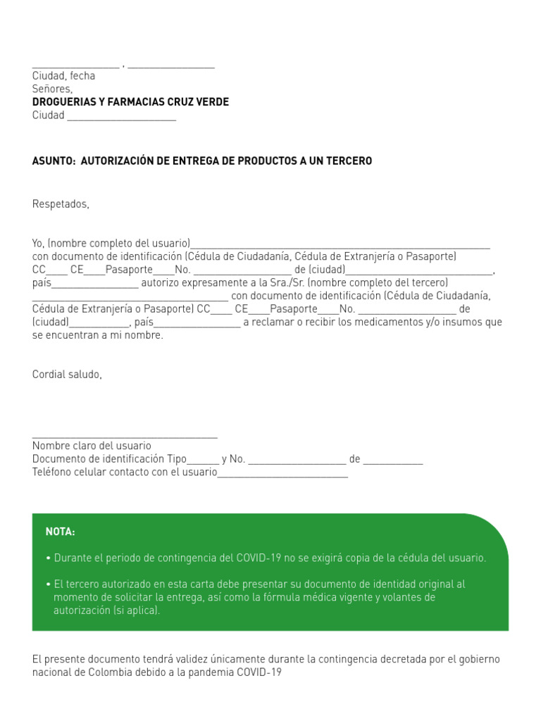 (ciudad)___________, país________________ a reclamar o recibir los medicamentos y/o insumos que