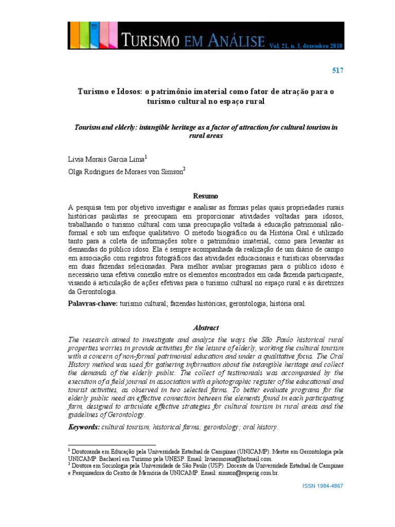 Tourism and elderly: intangible heritage as a factor of attraction for cultural tourism in rural areas Lvia Morais Garcia Lima1 Olga Rodrigues de Moraes von Simson2 Resumo A pesquisa tem por objetivo investigar e analisar as formas pelas quais propriedades rurais histricas paulistas se preocupam em proporcionar atividades voltadas para idosos, trabalhando o turismo cultural com uma preocupao voltada educao patrimonial noformal e sob um enfoque qualitativo. O mtodo biogrfico ou da Histria Oral utilizado tanto para a coleta de informaes sobre o patrimnio imaterial, como para levantar as demandas do pblico idoso. Ela sempre acompanhada da realizao de um dirio de campo em associao com registros fotogrficos das atividades educacionais e tursticas observadas em duas fazendas selecionadas. Para melhor avaliar programas para o pblico idoso necessrio uma efetiva conexo entre os elementos encontrados em cada fazenda participante, visando articulao de aes efetivas para o turismo cultural no espao rural e s diretrizes da Gerontologia. Palavras-chave: turismo cultural; fazendas histricas; gerontologia; histria oral. Abstract The research aimed to investigate and analyze the ways the So Paulo historical rural properties worries in provide activities for the leisure of elderly, working the cultural tourism with a concern of non-formal patrimonial education and under a qualitative focus. The Oral History method was used for gathering information about the intangible heritage and collect the demands of the elderly public. The collect of testimonials was accompanied by the execution of a field journal in association with a photographic register of the educational and tourist activities, as observed in two selected farms. To better evaluate programs for the elderly public need an effective connection between the elements found in each participating farm, designed to articulate effective strategies for cultural tourism in rural areas and the guidelines of Gerontology. Keywords: cultural tourism; historical farms; gerontology; oral history.