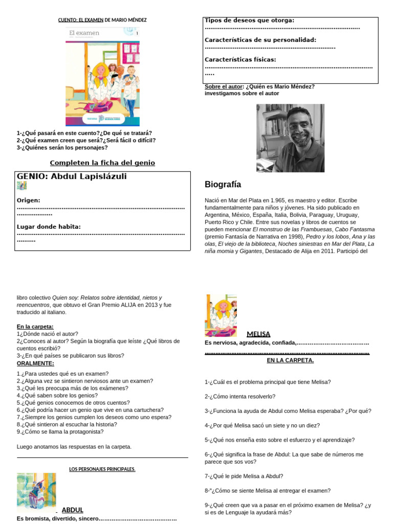 CUENTO: EL EXAMEN DE MARIO MÉNDEZ Tipos de deseos que otorga: