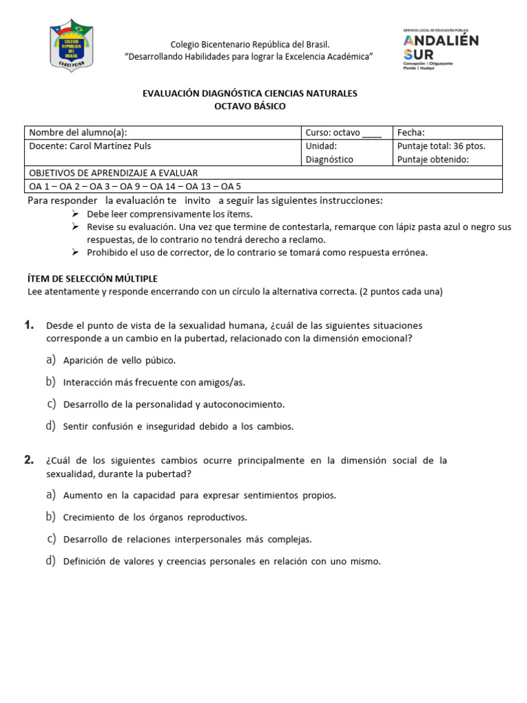 Docente: Carol Martínez Puls Unidad: Puntaje total: 36 ptos.
