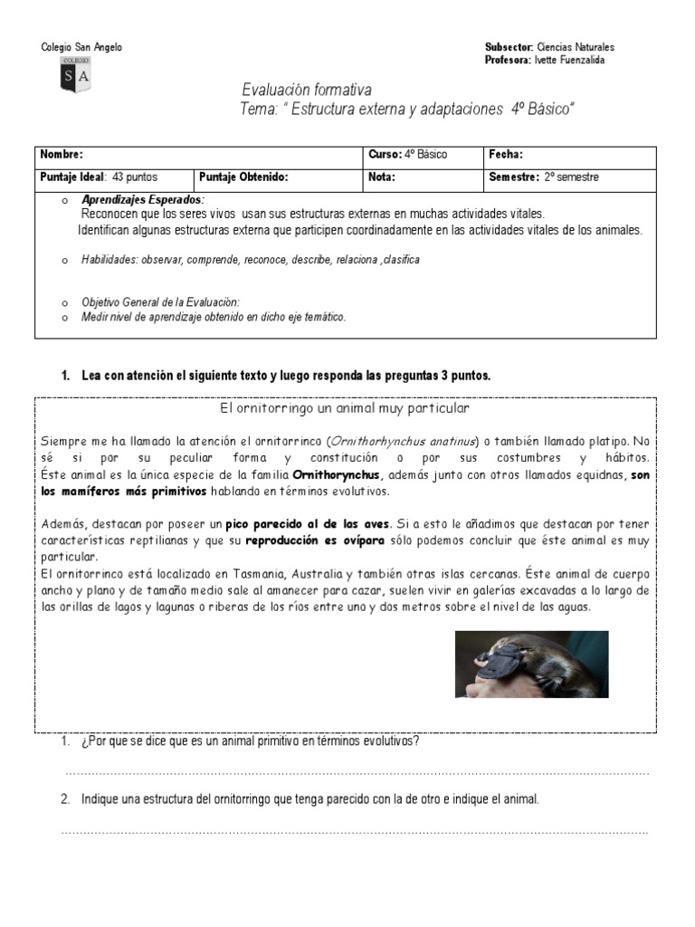 1. Lea con atencin el siguiente texto y luego responda las preguntas 3 puntos. El ornitorringo un animal muy particular