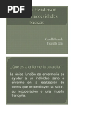 Las actividades que las enfermeras realizan para suplir o ayudar al paciente a cubrir estas necesidades es lo que V. Henderson denomina cuidados bsicos de enfermera. Estos cuidados bsicos se aplican a travs de un plan de cuidados de enfermera, elaborado en razn de las necesidades detectadas en el paciente. Describe la relacin enfermera - paciente, destacando tres niveles de intervencin: como sustituta, como ayuda o como compaera.