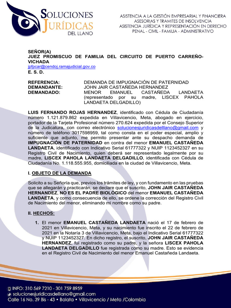 IMPUGNACIÓN DE PATERNIDAD en contra del menor EMANUEL CASTAÑEDA