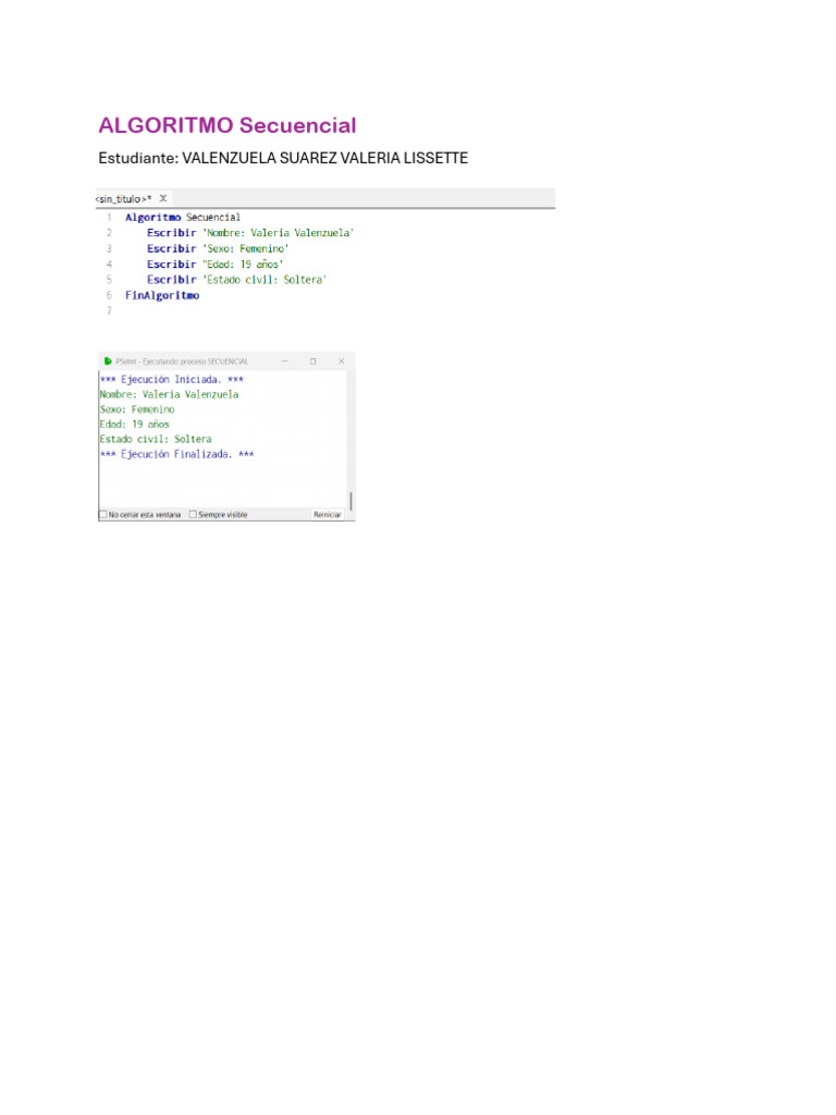El documento presenta un algoritmo secuencial desarrollado por la estudiante Valenzuela Suarez Valeria Lissette. Se enfoca en la estructura y funcionamiento del algoritmo. No se proporcionan detalles adicionales sobre su aplicación o resultados.