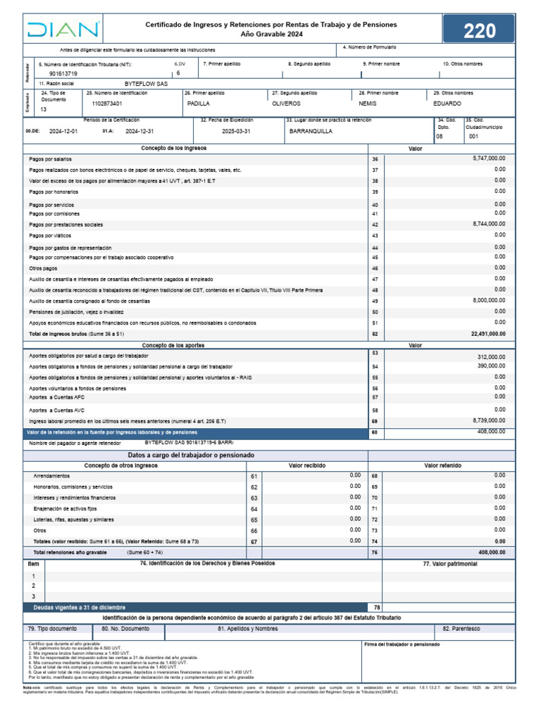 Nombre del pagador o agente retenedor BYTEFLOW SAS 901613719-6 BARRANQUILLA